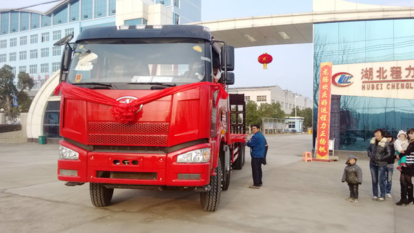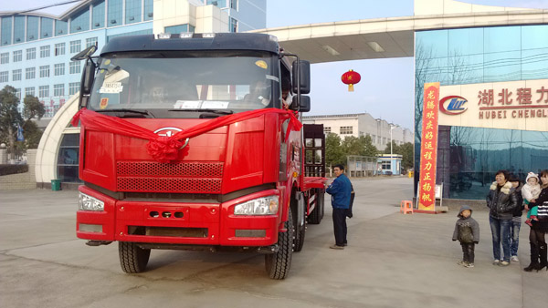 該車于年前客戶定購,于今天昨日交付給客戶,因為在客戶在我公司辦理分期付款業(yè)務,在我市上戶,年檢也在我市,客戶對我們說:“其實上我市的牌照還省心些,上客戶當?shù)氐呐普漳陮忂€要季審,年審,費用也需要3000多,還不如一次性交由我公司來年審,省時省心!”。今天客戶在我市辦理上牌手續(xù)及辦理營運證。于晚上客戶提車走。客戶對這輛解放J6前四后八平板運輸車非常滿意。