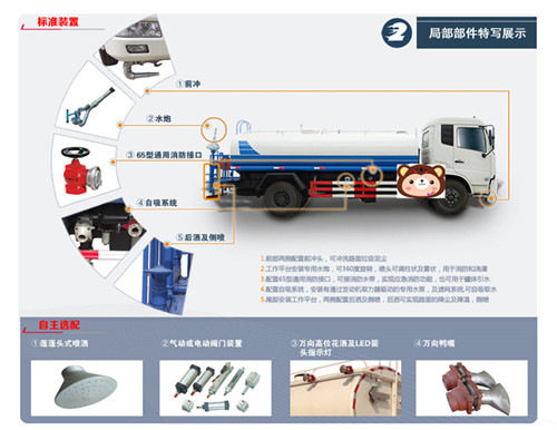 5方東風(fēng)多利卡灑水車基本組成:罐體,取力器,專用自吸式灑水泵,管網(wǎng),噴灑出口,工作平臺(tái),二類底盤.灑水車罐體材質(zhì)為Q235國(guó)標(biāo)碳鋼,厚度為4MM,帶大功率專用灑水泵,前沖、側(cè)噴、后灑,帶后工作平臺(tái)和灑水高炮,自流閥及消防接頭各一個(gè),水管三米2根。