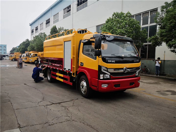 上裝配置:罐體采用國標(biāo)碳鋼板,污水罐4方(罐體標(biāo)準(zhǔn)6個厚),清水罐2方(罐體標(biāo)準(zhǔn)4個厚),配山東淄博SK-9水循環(huán)泵,德國品孚170流量24兆帕高壓泵,尾部帶一個100mm進(jìn)污口,一個150mm排污口,罐體左右各一個消防接口,水污互通,頂部防溢閥處加一個濾網(wǎng)三通,標(biāo)配一根8米吸污管,一根60米19#高壓軟管,10個高壓噴頭。罐體液壓舉升,尾部液壓打開。