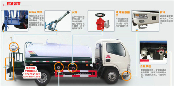 東風(fēng)多利卡灑水車:該車采用東風(fēng)朝陽(yáng)120馬力和東風(fēng)康明斯140馬力柴油發(fā)動(dòng)機(jī),罐體有效容積:6噸-9噸,帶國(guó)家免征公告。
