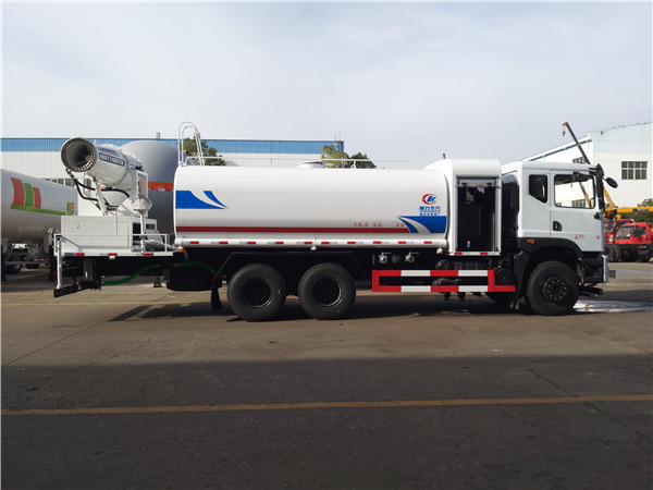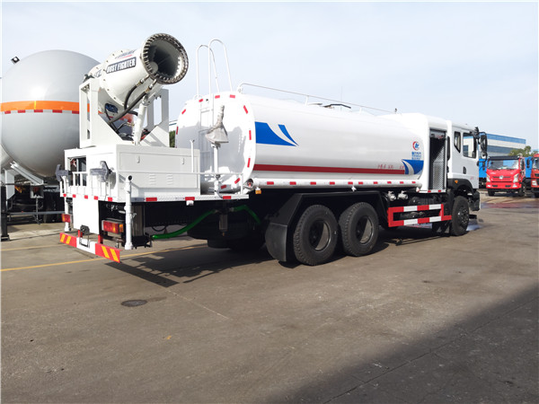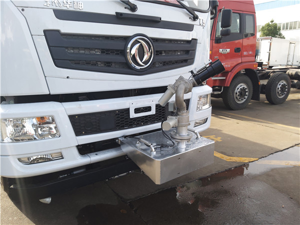 6、東風(fēng)灑水車采用氣動裝置,可在駕駛室內(nèi)控制出水。具有前沖、后灑、側(cè)噴、后工作平臺,高壓綠化水炮。